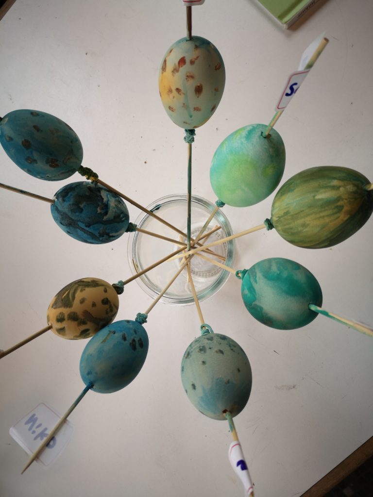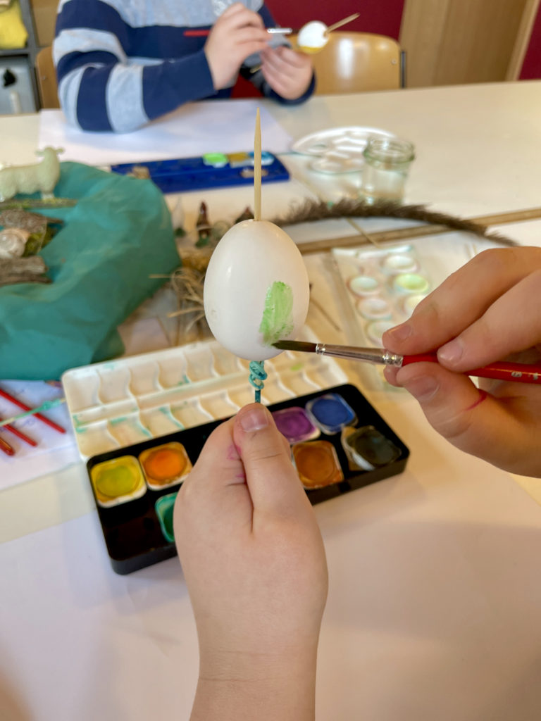 Kurz vor Ostern standen natürlich auch bei uns die Eier im Mittelpunkt. Die Vielfalt der Vogeleier wurde den Kindern anhand von Bildkarten bewusst gemacht. Anschließend durften sie ihre eigenen Hühnereier nach Herzenslust bemalen und gestalten – es entstanden wahre Kunstwerke.