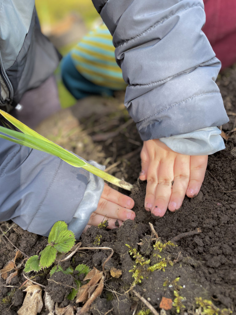 Aber natürlich kam auch das Gärtnern nicht zu kurz. Unter anderem haben wir Zwiebeln und Knoblauch in die Erde gesetzt und dabei viele faszinierende Entdeckungen gemacht. Der Garten bietet den Kindern einen Ort der Ruhe und gleichzeitig Motivation, jeden Tag mit großer Neugier und Wissensdurst zu erleben.