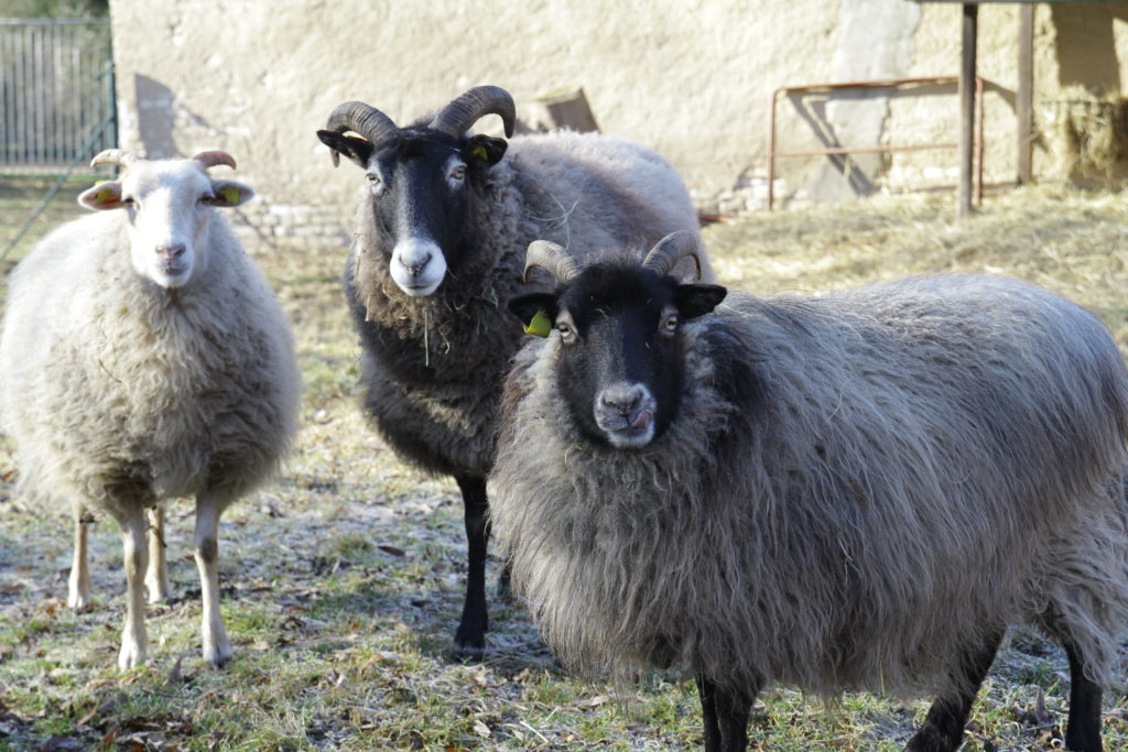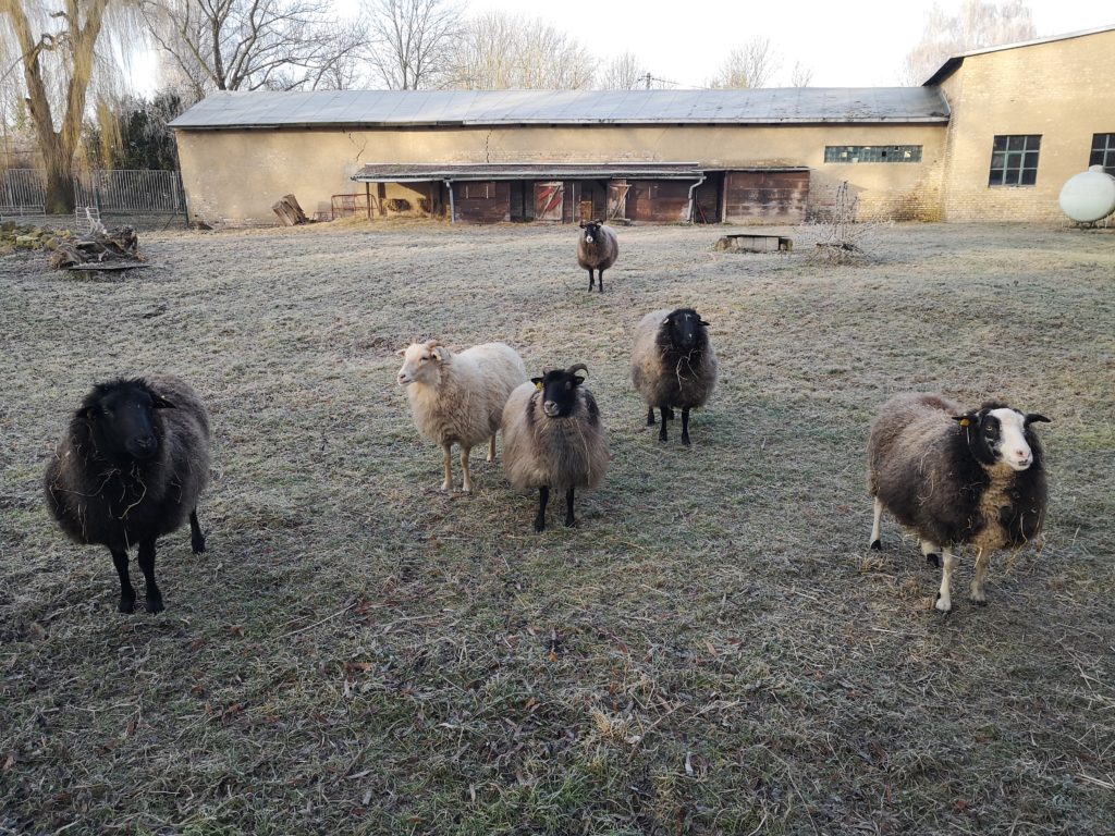 Drei Schafe, die bereits Bekanntschaft mit Gustav, Gerda und Gerd machen konnten, sind nun Teil der Herde. Sie lebten vor unserem Umzug nach Stichelsdorf bereits zeitweise auf dem Gutshof, nun sind sie in einer neuen Gruppe zusammen und nehmen auch schon Kontakt mit den Kindern auf.