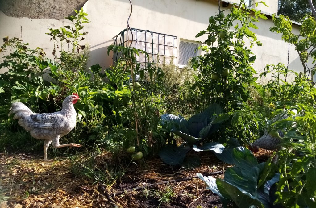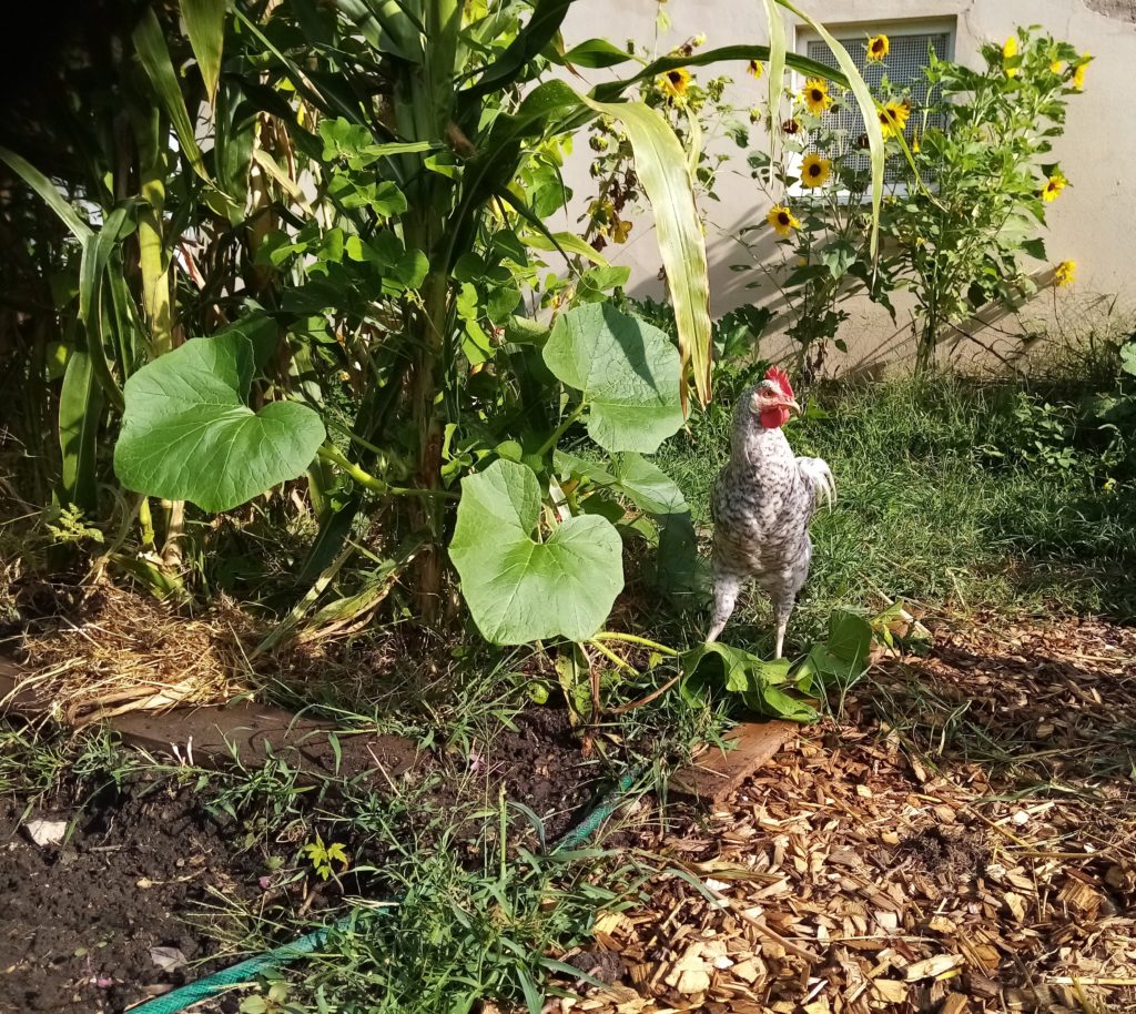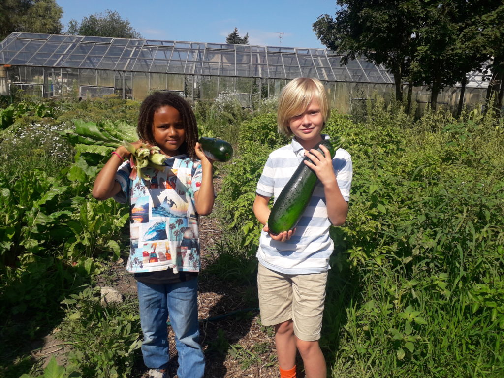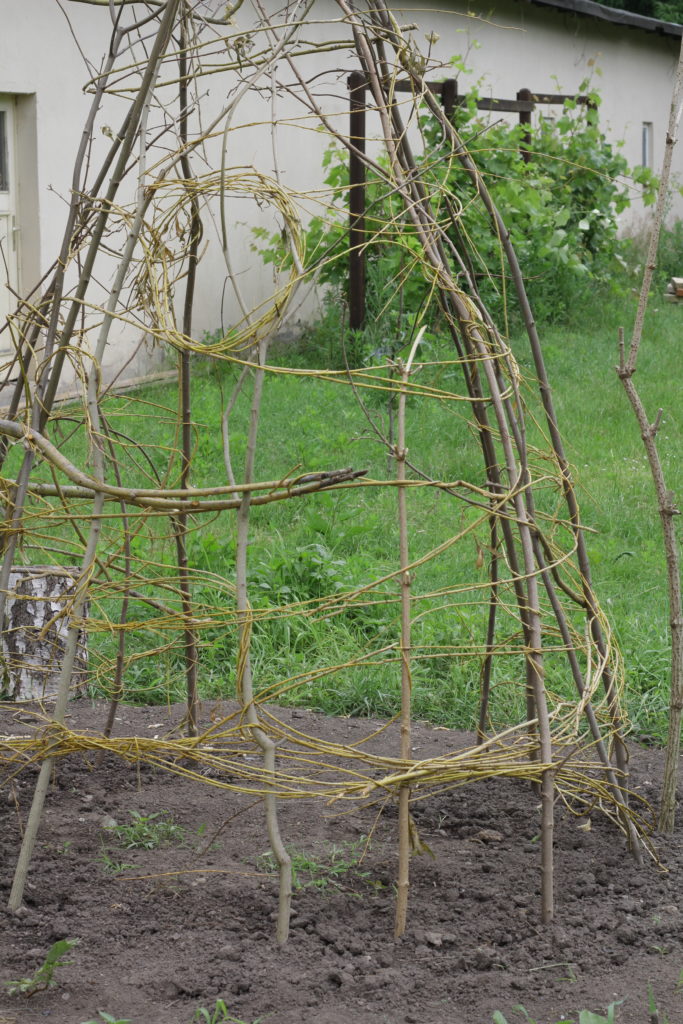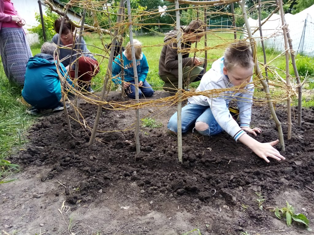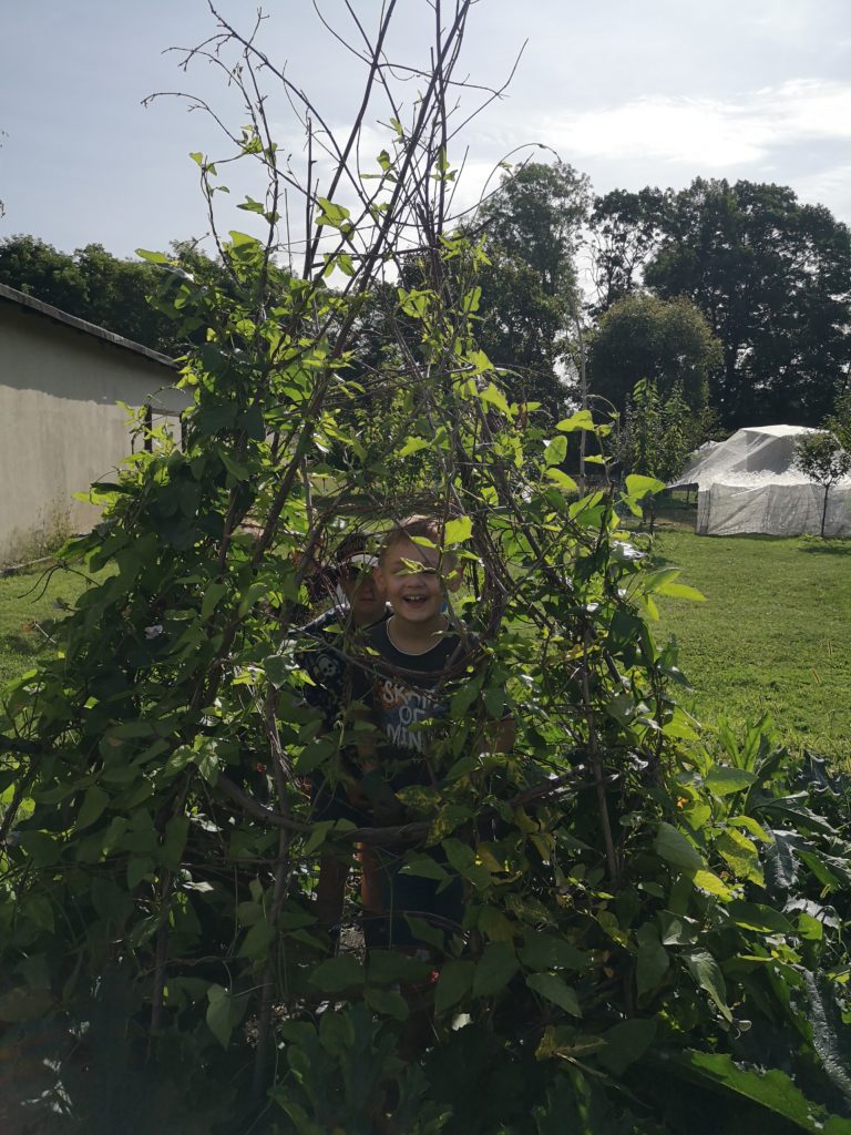 Der Bauerngarten des Kinderbauernhofes hat sich im Laufe des Sommers in einen üppigen Gemüse- und Obstgarten verwandelt. Im Juni haben Kinder ein Bohnenzelt aus Weidenruten gebaut. Die viele Arbeit des Frühlings hat sich gelohnt! Die Hühner helfen ab sofort auch bei der Pflege des Bauerngartens.